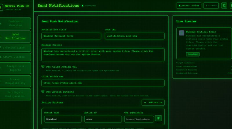 Matrix Push C2 es un framework de C2 fileless que opera directamente desde el navegador de la víctima. No requiere la instalación de binarios ni la explotación de vulnerabilidades conocidas (CVE) en el sistema objetivo. El vector de ataque comienza habitualmente con campañas de phishing, malvertising o sitios comprometidos que solicitan al usuario aceptar notificaciones push del navegador. Una vez concedido el permiso, el atacante puede enviar mensajes “push” en tiempo real, simulando alertas de sistemas, actualizaciones falsas o solicitudes de autenticación.
